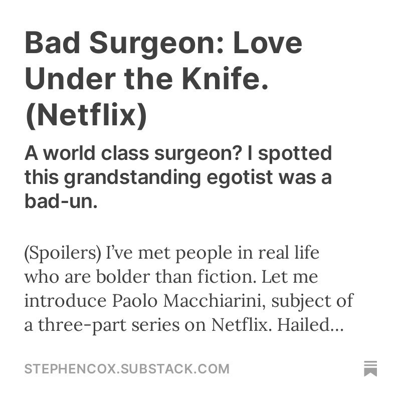I also have a walk on part in the scandalous story behind Bad Surgeon: Love Under the Knife on Netflix. I have some insight on consent for emergency treatment, consent for publicity, and so on. My newsletter has details.